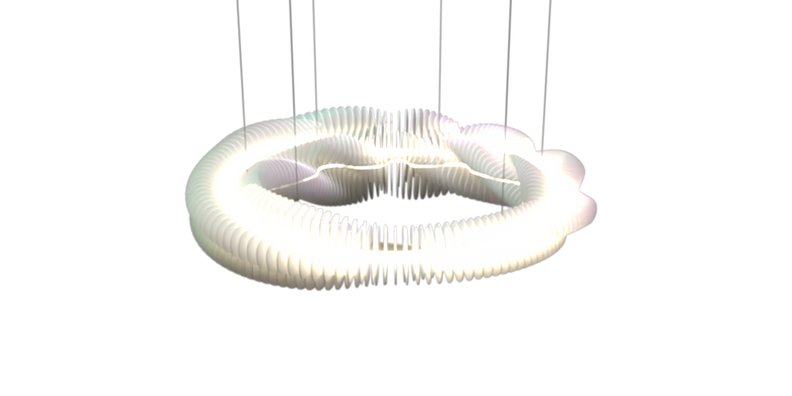 Illuminated by a state of the art 2 meter Opal 360 LED light tube by ProLED from 900 (3000K warm white) to 1000 (4000K neutral white) lumens/meter without glare. The design of the Campylodiscus Chandelier enables the ProLED Opal 360's full potential ensuring an even distribution of light with no cast shadow.